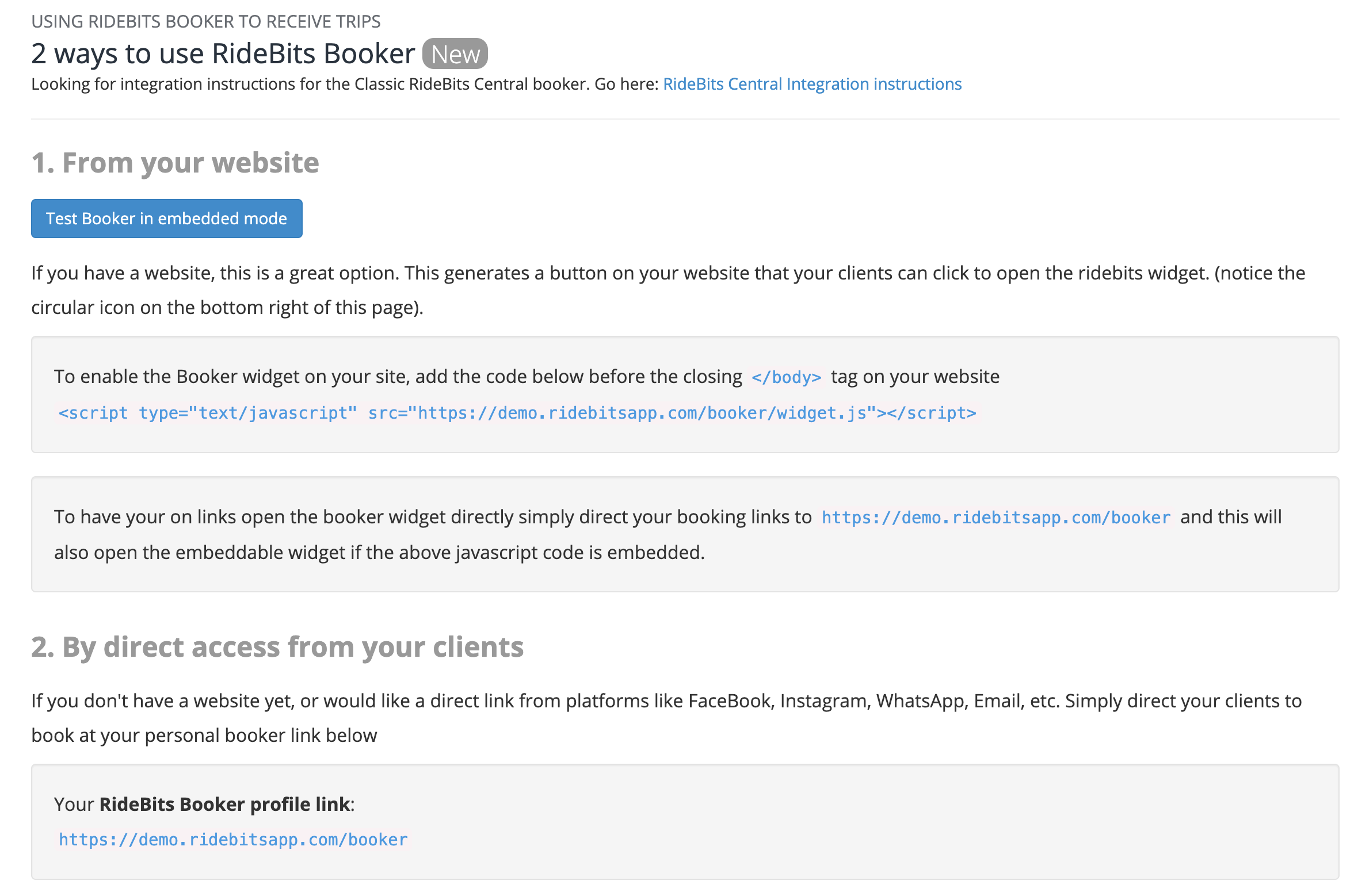 With a RideBits account, you'll get access to a basic set of instructions that you can implement on your Tranportation Company's website or share with the team/person that manages your site for you.
